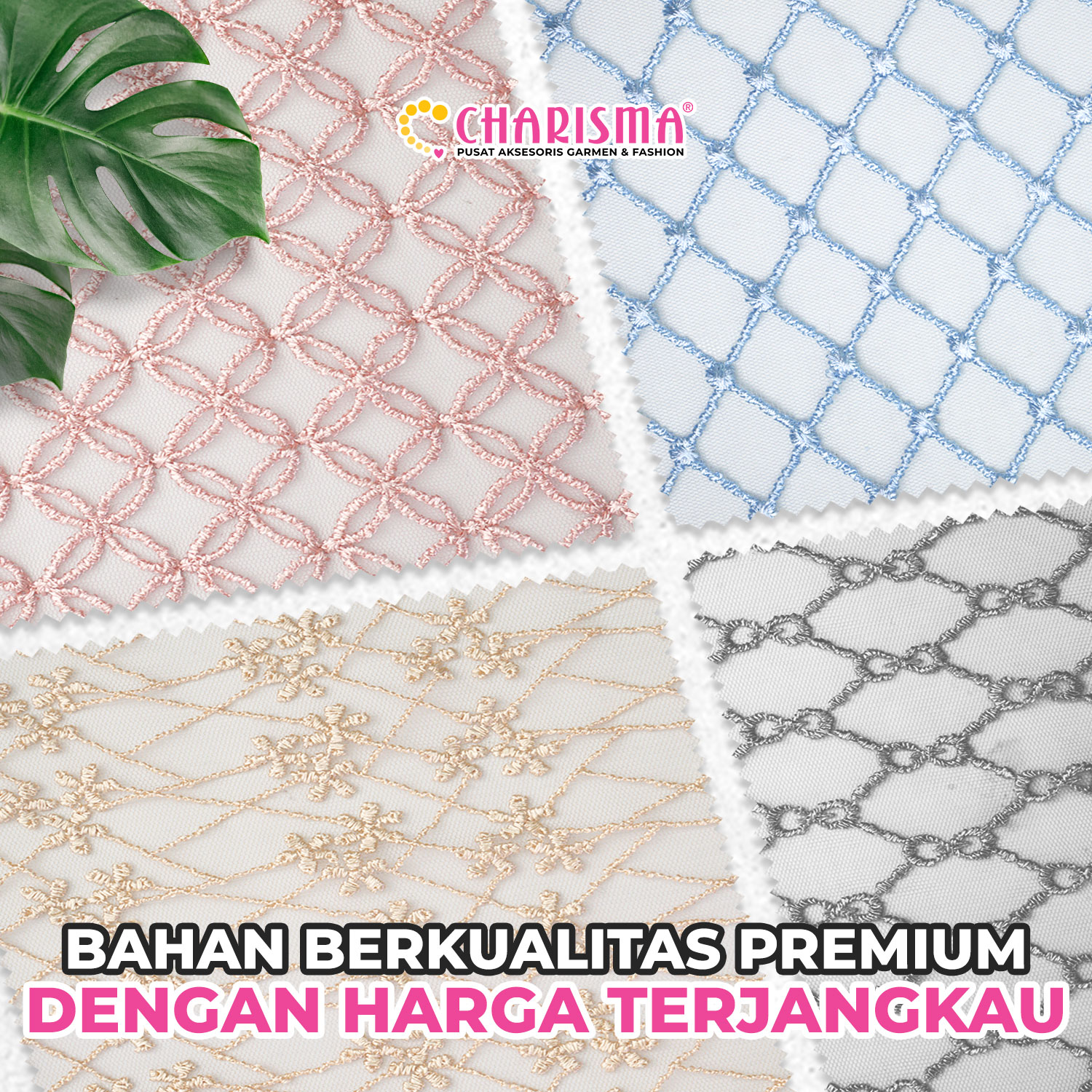Jangan khawatir, CHARISMA sebagai one stop shopping material fashion tangan pertama, sudah belasan tahun dipercaya ratusan fashionpreneur untuk menyediakan kebutuhan produksi mulai dari berbagai jenis kain, hingga aksesoris pelengkap seperti kancing, renda, rhinestone, label brand dan lain aksesoris lainnya yang dapat dikustomisasi sesuai dengan kebutuhan produksi fashionpreneur!
