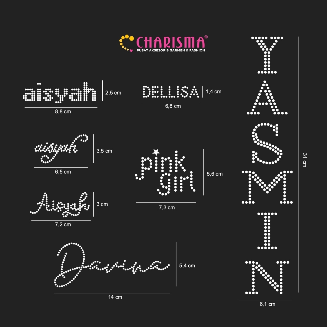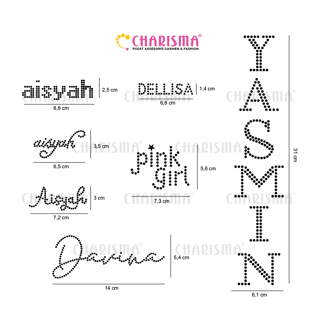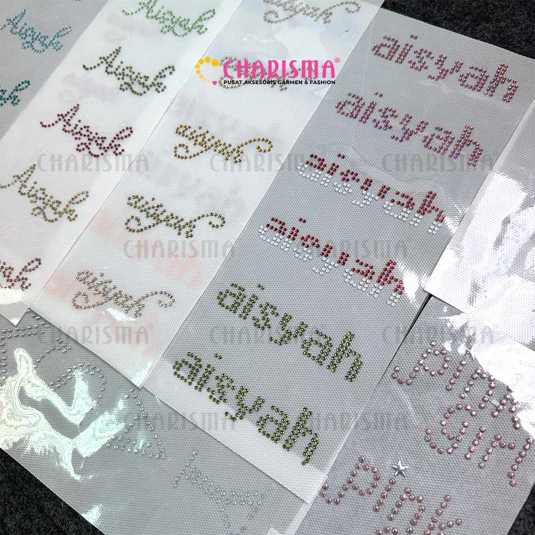 Charisma Mote Gosok Custom Huruf – solusi inovatif untuk memberikan sentuhan personal pada koleksi busana Anda. Mote Gosok Custom Huruf memberikan tampilan eksklusif dan autentik dengan menghadirkan desain huruf yang dapat disesuaikan dengan nama brand fashion Anda.