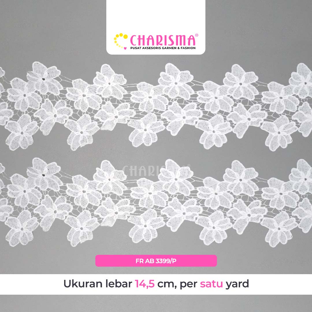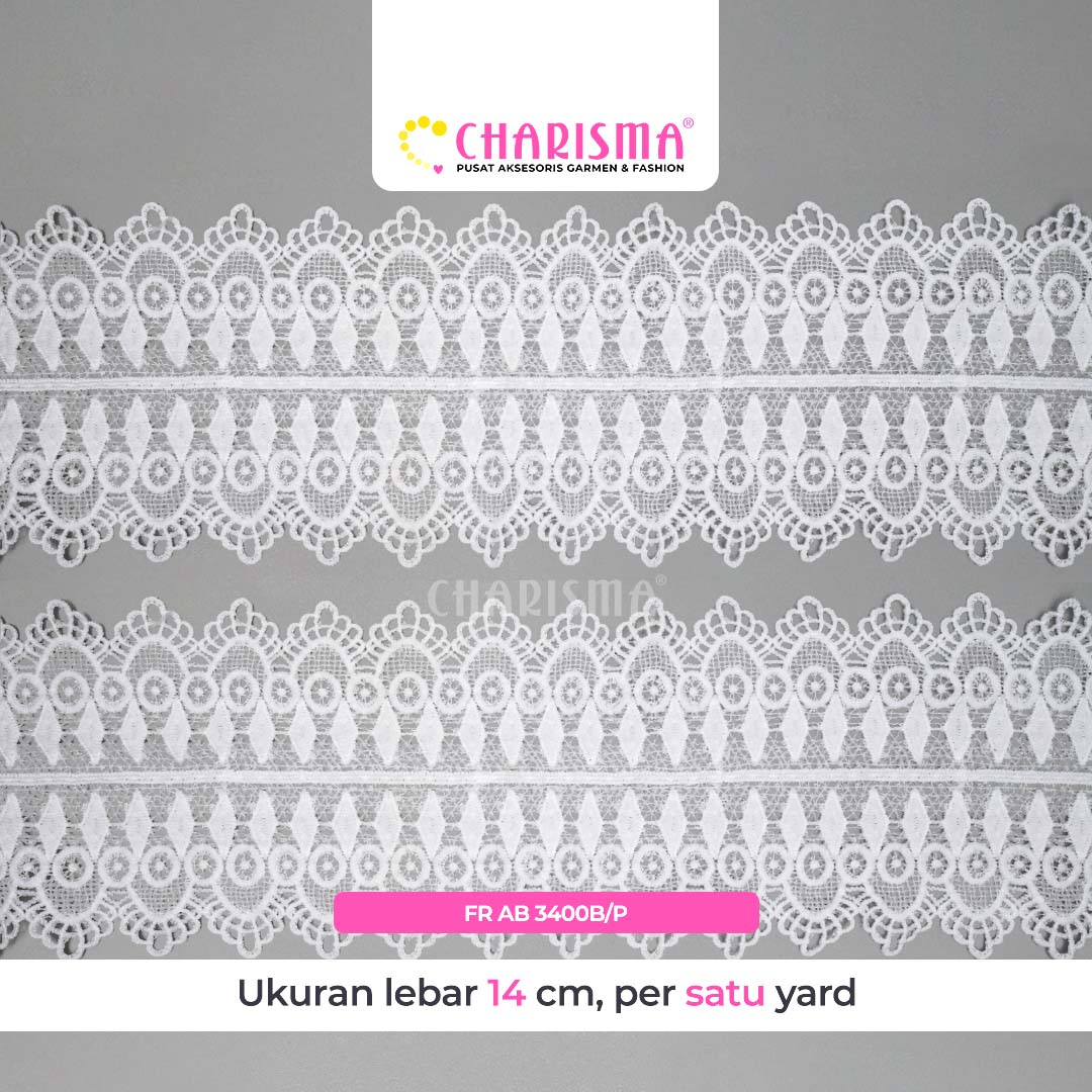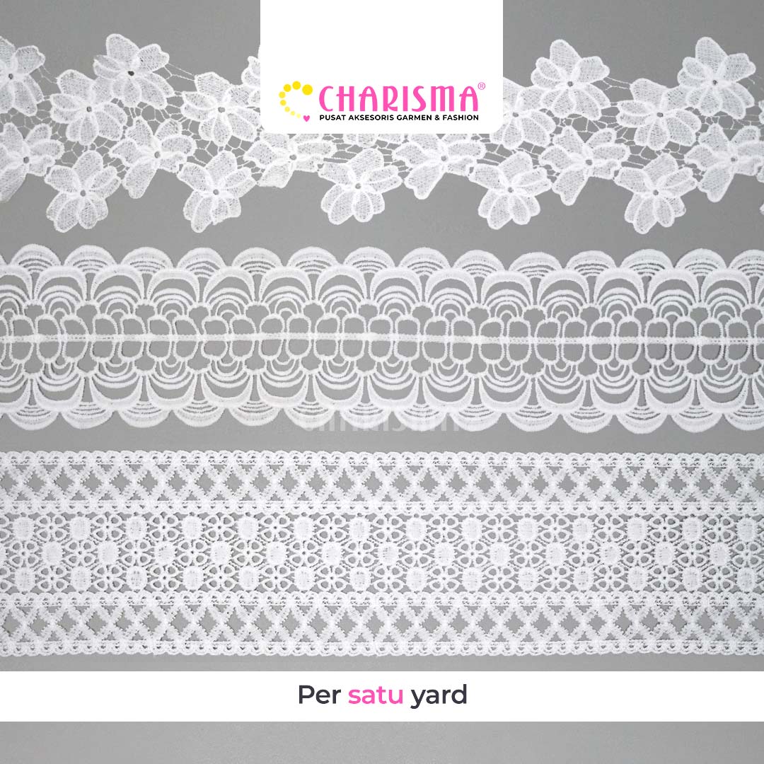 Charisma Renda Guiper putih ini terbuat dari polyester tekstur katun, banyak variasi ukuran dan model, cocok untuk diaplikasikan pada blouse, kemeja, dan untuk craft.