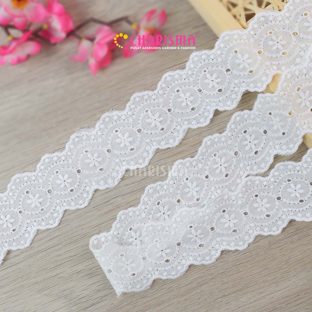 Charisma Renda Katun adalah sentuhan elegan untuk proyek kreasi Fashion-mu! Renda katun berkualitas tinggi ini memiliki lebar 4cm yang sempurna untuk menambahkan aksen cantik pada berbagai jenis karya tangan, pakaian hingga dekorasi pakaian.