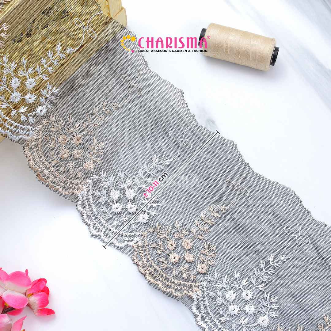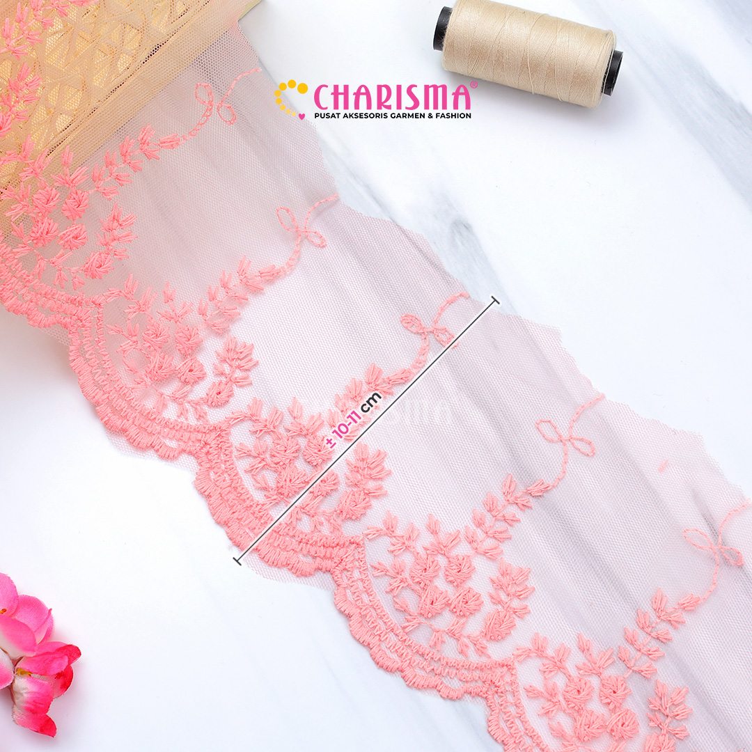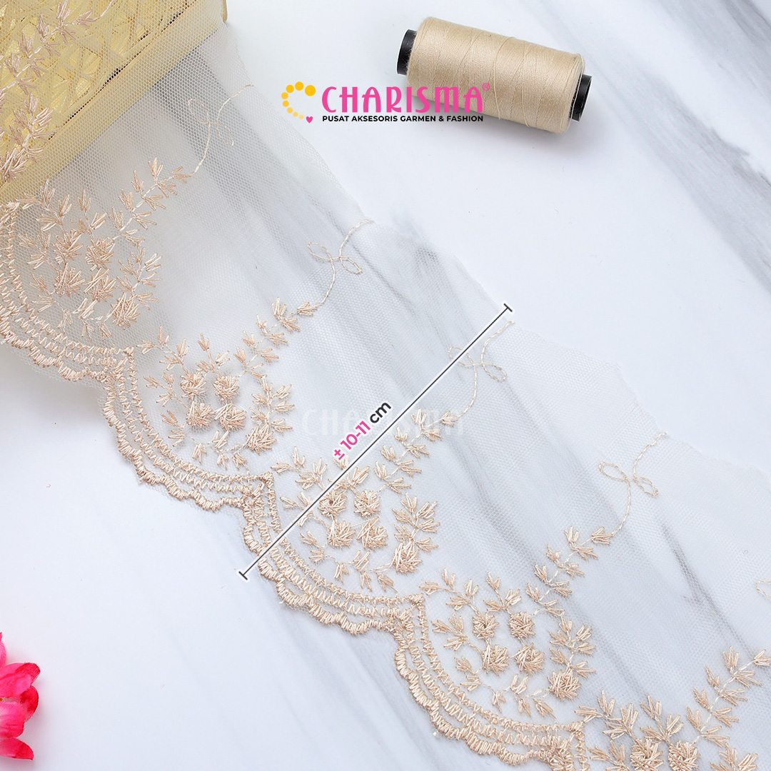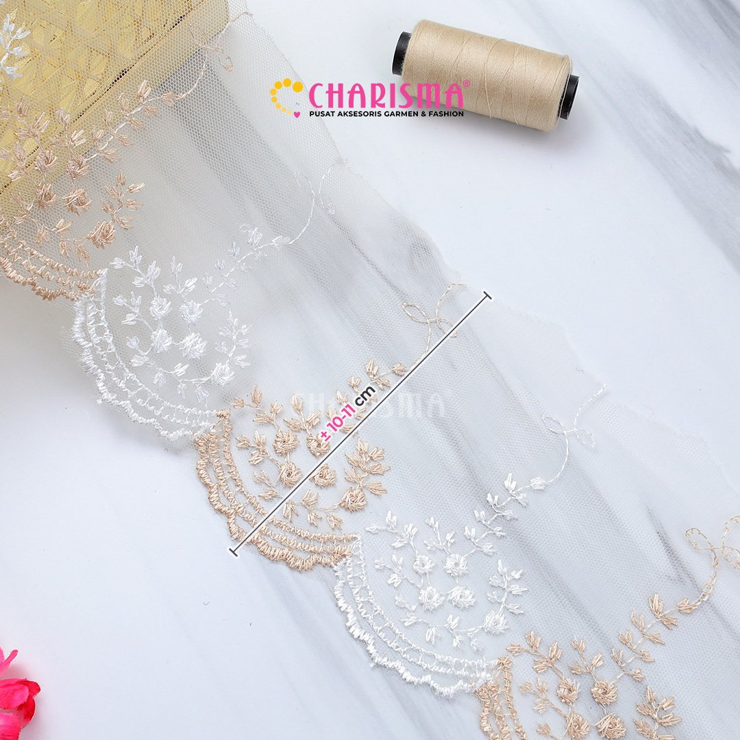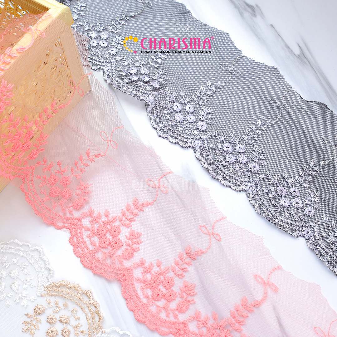 Bahan tulle yang ringan dan transparan, renda ini memberikan tampilan yang lembut dan anggun pada setiap proyek yang diaplikasikan.
